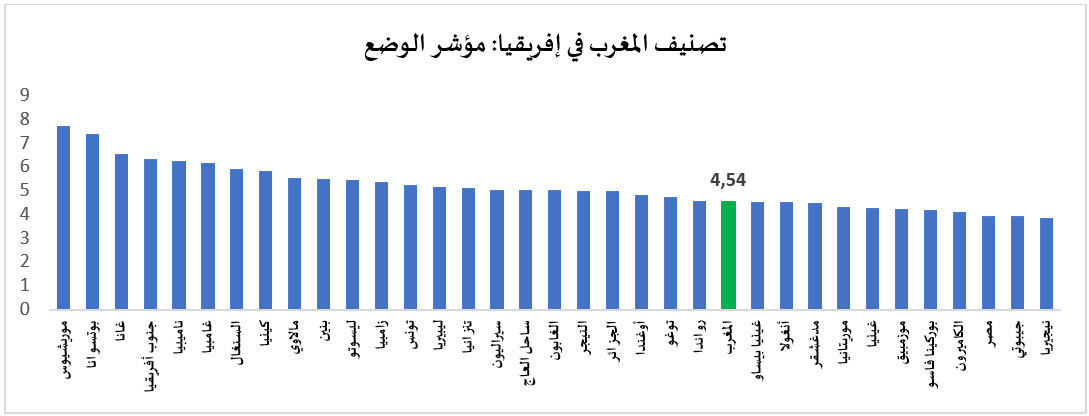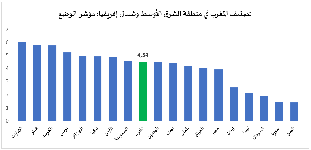 تراجع المغرب بدرجة واحدة في مؤشر الوضع، حيث انخفض معدله من 4.77 سنة 2022 (الرتبة 86 من بين 137 دولة) إلى 4.54 سنة 2024 (الرتبة 87 من بين 137 دولة)، بفارق قدره 0.23 نقطة؛