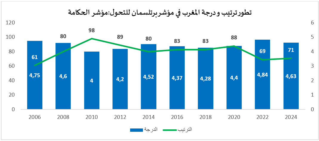 في مؤشر الحكامة، تراجع المغرب بدرجتين وخسر 0.21 نقطة، حيث انتقل من 4.84 سنة 2022 (الرتبة 69) إلى 4.36 سنة 2024 (الرتبة 71 من بين 137 دولة)؛