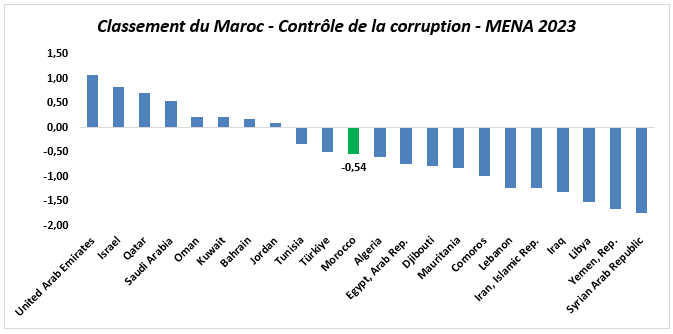• Sur la région MENA et par rapport à l’indicateur « contrôle de la corruption », le Maroc se classe dans la 11ème position. Par ailleurs, sur le continent africain il occupe la 20ème position.