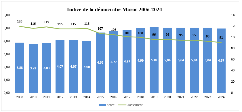 L'indice de démocratie de l'Economist Intelligence Unit, est établi sur une échelle de 0 à 10, sur la base des notes de 60 indicateurs, regroupés en cinq catégories : processus électoral et pluralisme, libertés civiles, Fonctionnement du gouvernement, participation politique, et la culture politique. Chaque catégorie a une note sur une échelle de 0 à 10, et l'indice global est la moyenne simple des cinq indices de catégorie.