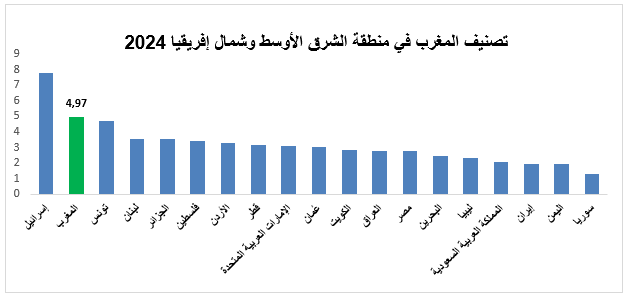 على مستوى منطقة الشرق الأوسط وشمال إفريقيا (MENA)، تقدّم المغرب بمركز واحد مقارنة بالإصدار السابق، ليحتل حالياً المرتبة الثانية إقليميًا بعد إسرائيل، مما يعكس تحسّنًا نسبياً في الأداء مقارنة بباقي دول المنطقة.