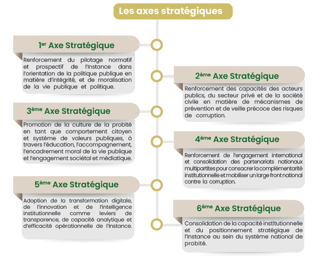 • Et la mise en place d’un parcours clair pour mesurer la transformation à l’année 2030, y compris la confiance dans les institutions, la qualité du service public, l’environnement d’investissement et l’impact des réformes sur la perception citoyenne ainsi que sur les indicateurs internationaux. Pour l’atteinte de cette finalité, la stratégie de l’Instance s’articule autour de six axes stratégiques structurants, représentant les niveaux fondamentaux d’intervention de l’Instance.